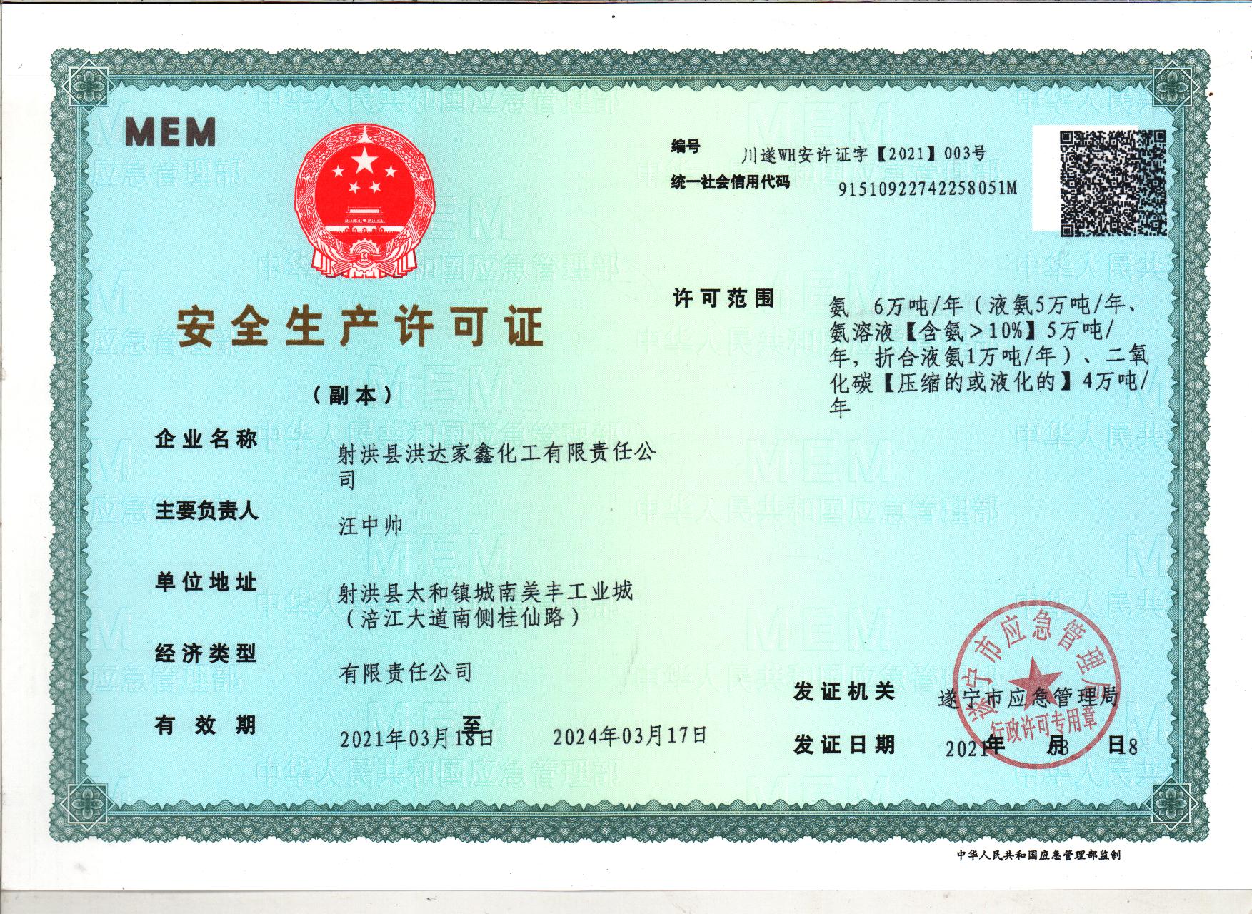 射洪縣洪達(dá)家鑫化工有限責(zé)任公司是一家年產(chǎn)6萬噸合成氨涉農(nóng)企業(yè),成立于2002年8月。公司2005年12月通過環(huán)評(píng)驗(yàn)收。 |